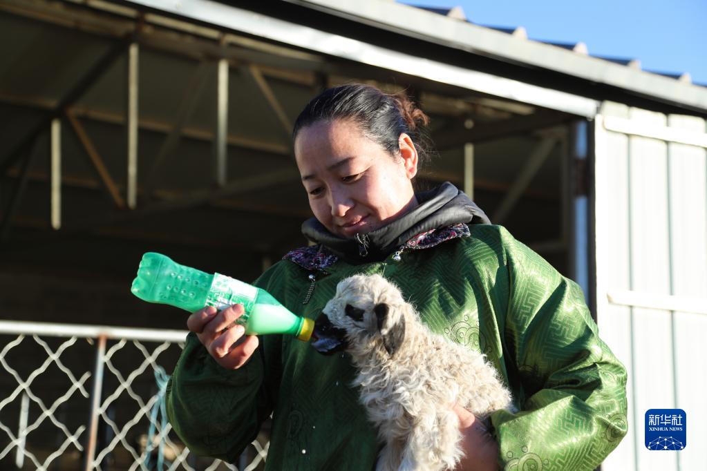 3月29日,朝克德力根的妻子孟根图雅用瓶子给小羊羔喂奶。