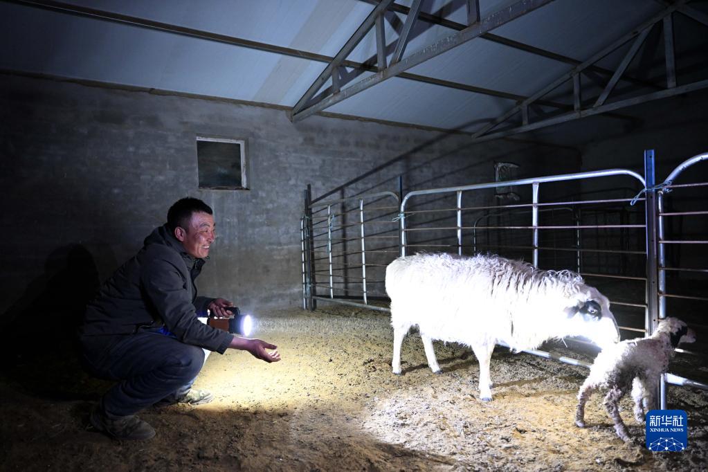 3月28日深夜,朝克德力根来到羊圈中查看母羊和新生羊羔的情况。