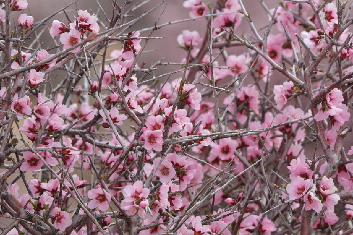“桃之夭夭,灼灼其华”,蒙古扁桃开花时一簇簇、一片片,粉白相间、高低错落、绚烂无比,远远望去如霞似锦,令人心旷神怡。