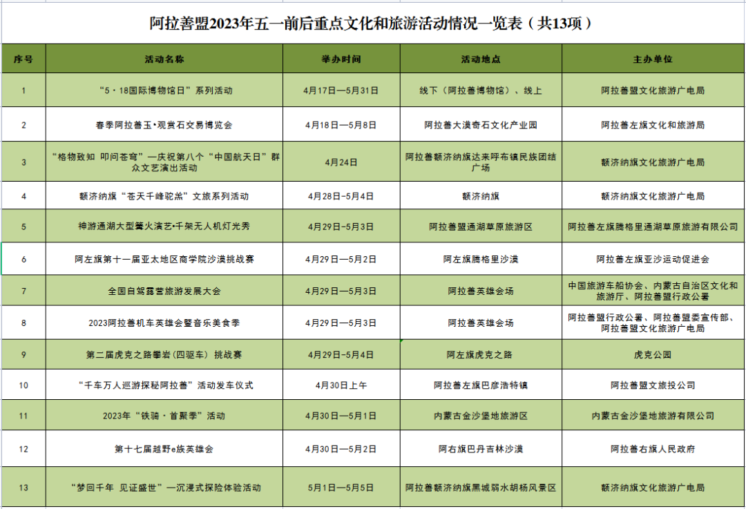 2023年全国自驾露营旅游发展大会将于4月29日-5月3日在阿拉善盟举办,2023机车英雄会暨音乐美食季、第17届越野e族英雄会、第十一届亚太地区商学院沙漠挑战赛、额济纳旗“苍天千峰驼羔”文旅系列活动等13项大会系列赛事节庆活动,精彩纷呈,等你来打卡!