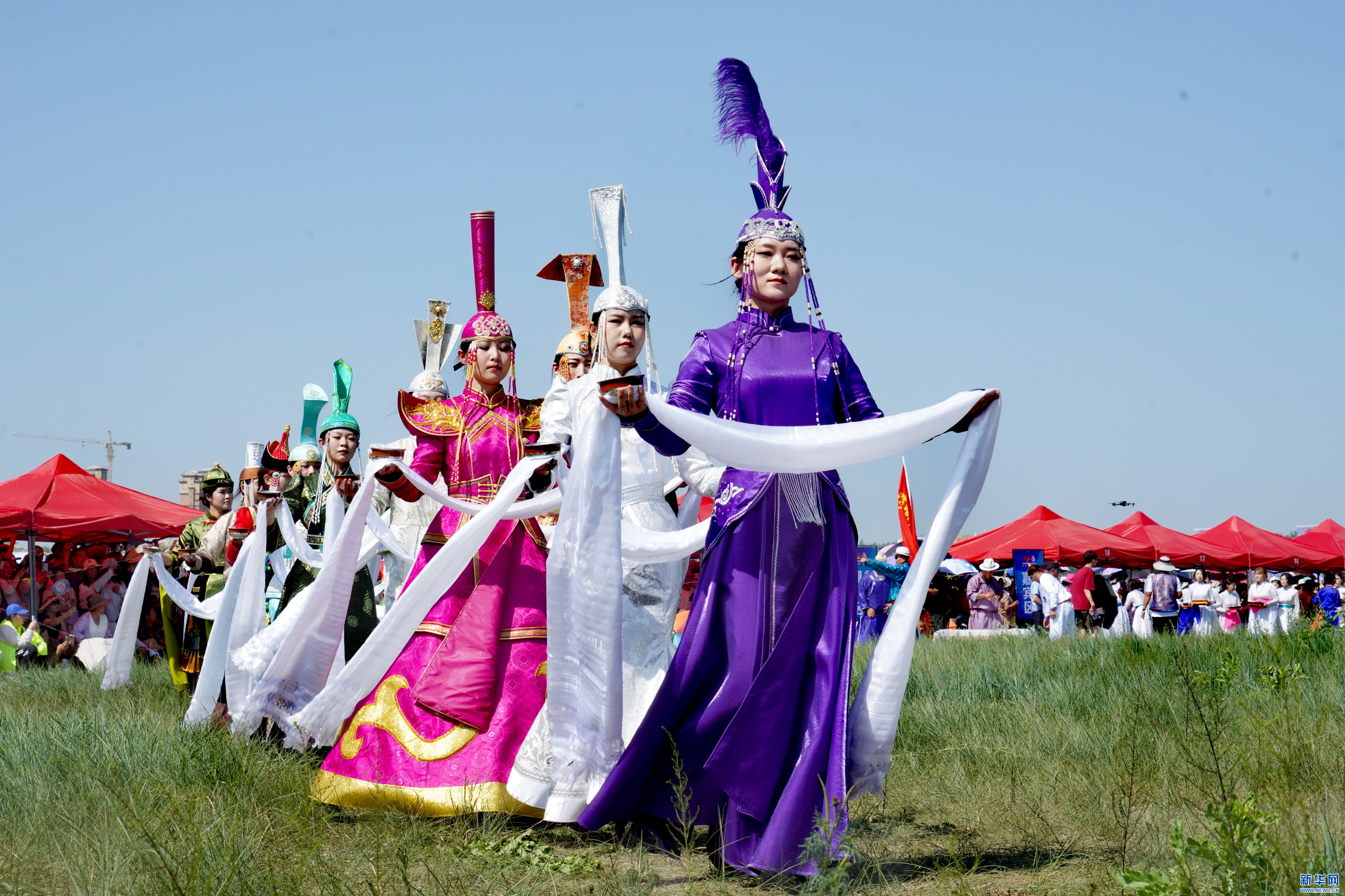 巴林左旗首届旅游那达慕开幕式上,蒙古族姑娘敬献哈达。新华网发(赵树宴 摄)