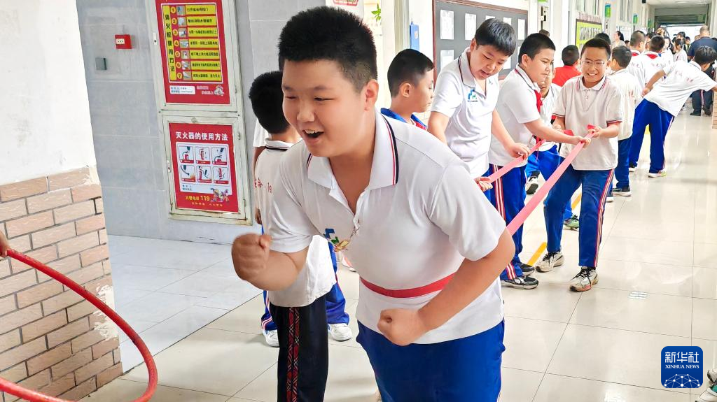 9月4日,准格尔旗大路第一小学的学生在课间休息期间玩拉力带。新华社发(李嘉露 摄)