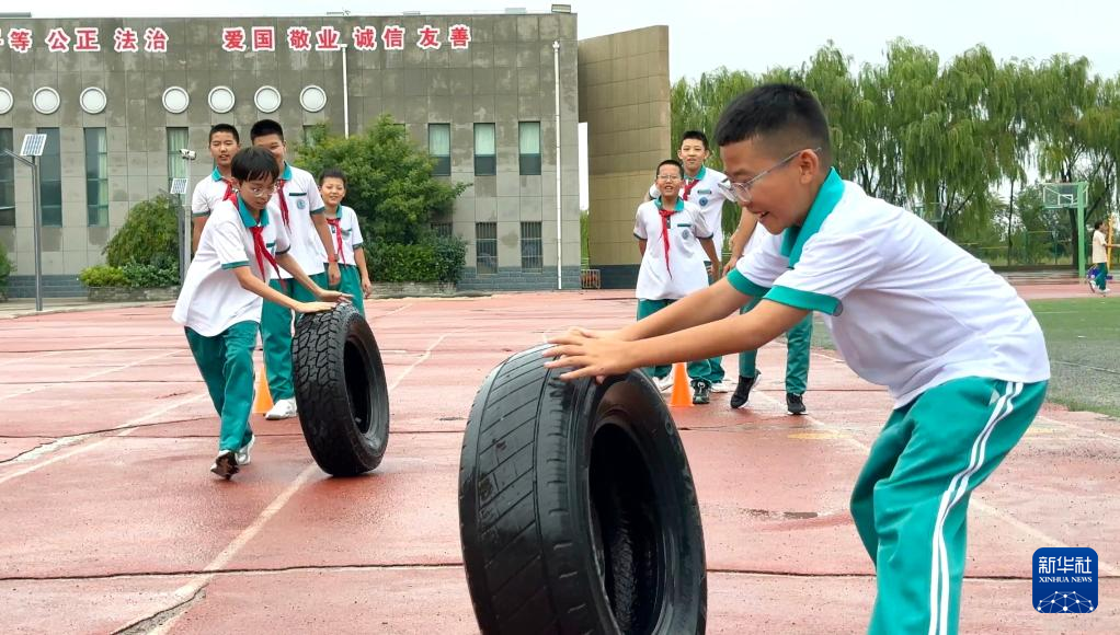 9月4日,准格尔旗大路第一小学的学生们课间休息期间在操场玩滚轮胎的游戏。新华社发(李嘉露 摄)