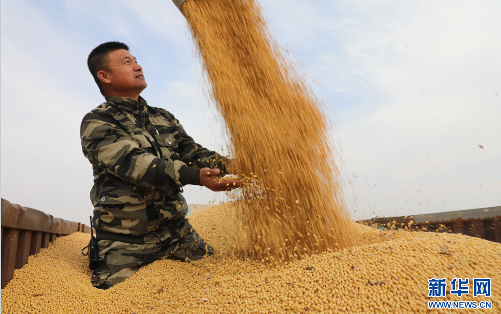 9月28日,农场职工在内蒙古自治区扎兰屯市大河湾农牧场田间查看大豆品质。新华网发(韩颖群 摄)