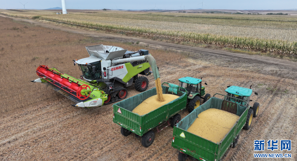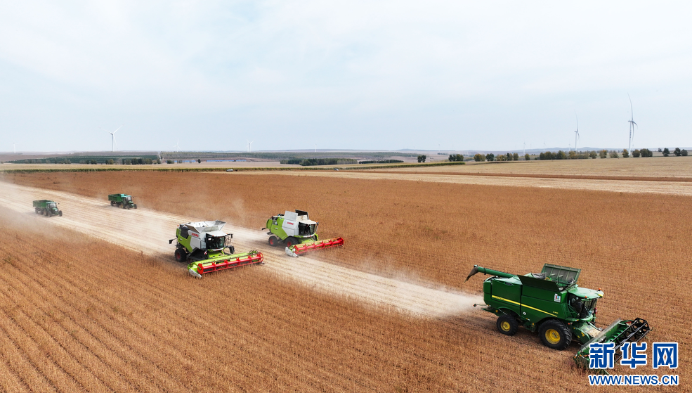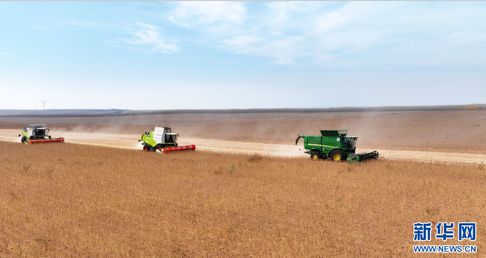 9月28日,联合收割机在内蒙古自治区扎兰屯市大河湾农牧场田间收获大豆。新华网发(韩颖群 摄)