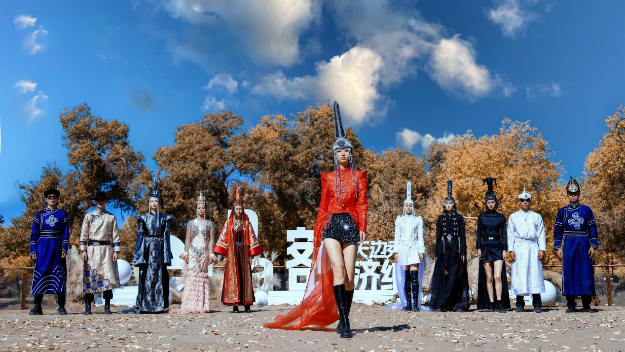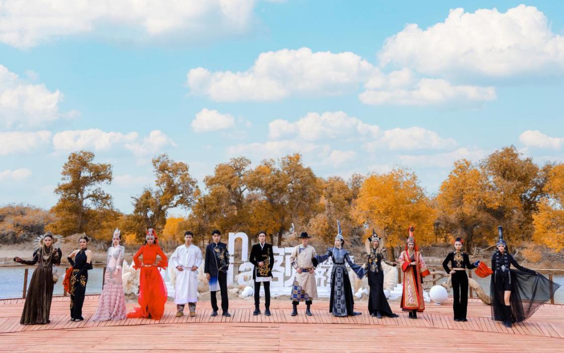 活动现场,模特们身着华丽的蒙古族传统服饰,漫步胡杨林间,尽情展示草原儿女的万种风情。