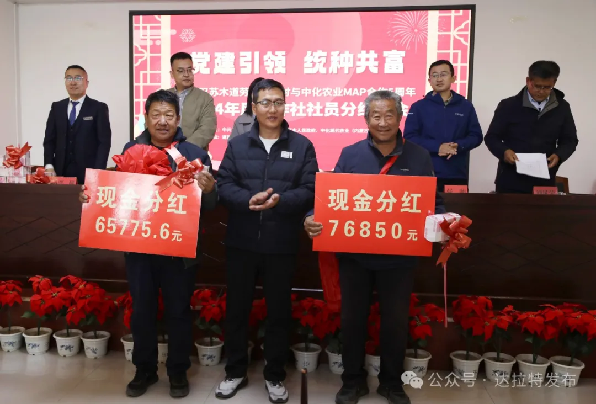 大笔分红的背后,得益于走“党建引领统种共富”的路子,改变了过去一家一户单打独斗的传统种植模式,同时还坚持农牧民专业合作社抱团与公司合作发展。展旦召苏木道劳哈勒正村从2021年开始连续3年与中化农业合作,实现了水肥一体化管理和全程数字化服务新突破;与骑士牧场签订青贮种植订单、与贵阳南明老干妈风味食品有限责任公司签订辣椒种植订单,形成了农民土地入股、合作社经营管理、社会化服务企业全程服务、农牧业龙头企业订单包销、社员分红挣钱的统种共富体系。