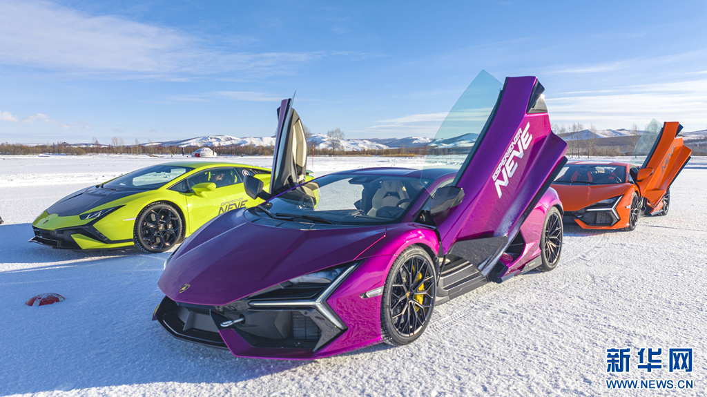 12月7日,兰博基尼车队在牙克石市冬季试车场进行雪地表演。新华网发(乐炎 摄)