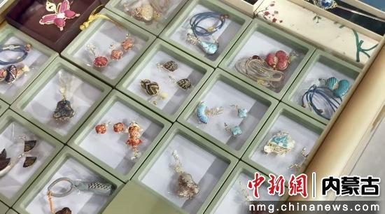 转入文创作品区,眼前瞬间明亮起来。精巧的耳环、胸针、项链在灯光下闪烁,皮质手包、精美发簪等陈列在展台上,每一件都充满巧思。这些作品大多来自牧勒工坊、内蒙古众益残疾人服务中心等企业和辅助性就业基地,由听障、肢残人士亲手制作。一位志愿者拿起一枚做工精巧、古风古韵的发卡介绍:“这里的每一针每一线,都是他们反复练习的结果。”