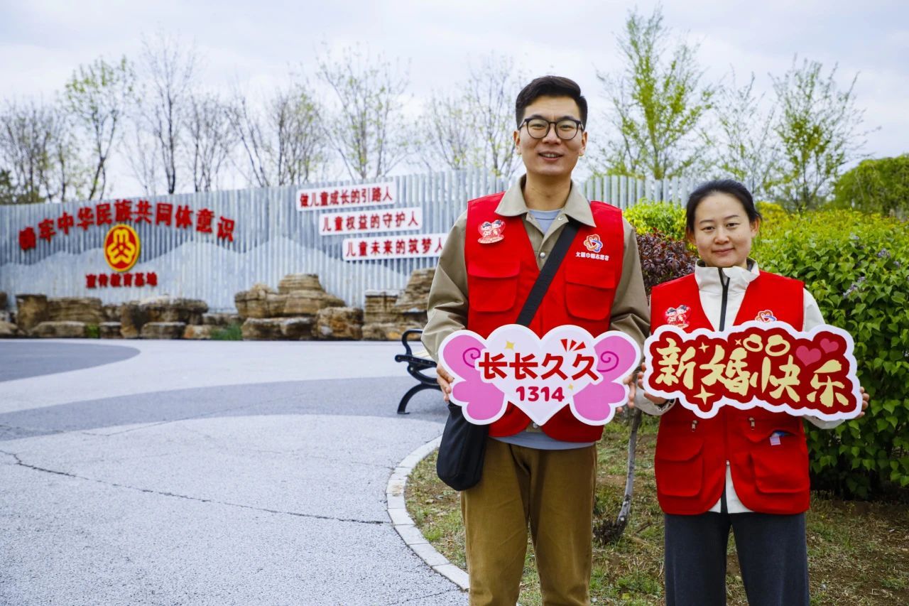 一对新人在内蒙古妇女儿童公园栽下“同心树”。 (内蒙古自治区妇联供图)