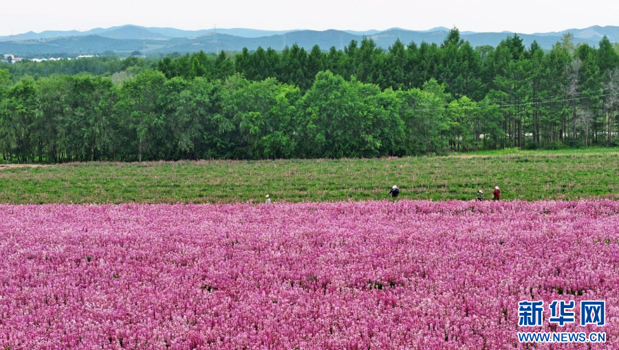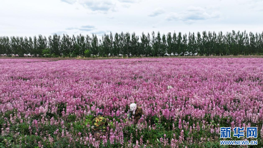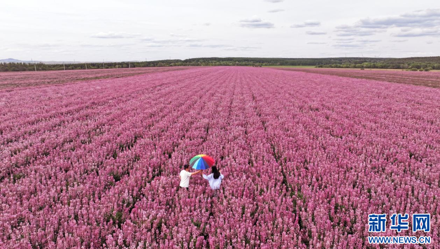 6月15日,内蒙古扎兰屯市成吉思汗镇繁荣村白鲜皮基地,游客在花间赏花游玩。新华网发(韩颖群 摄)