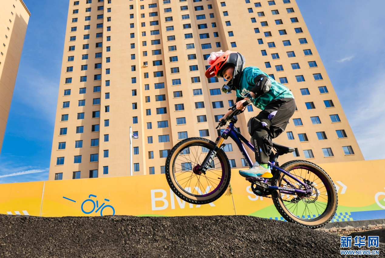 7月30日,小骑手在呼和浩特市玉泉区劢立体育文化产业园(原制锁厂)泵道骑行区进行骑行训练。新华网发(丁根厚 摄)