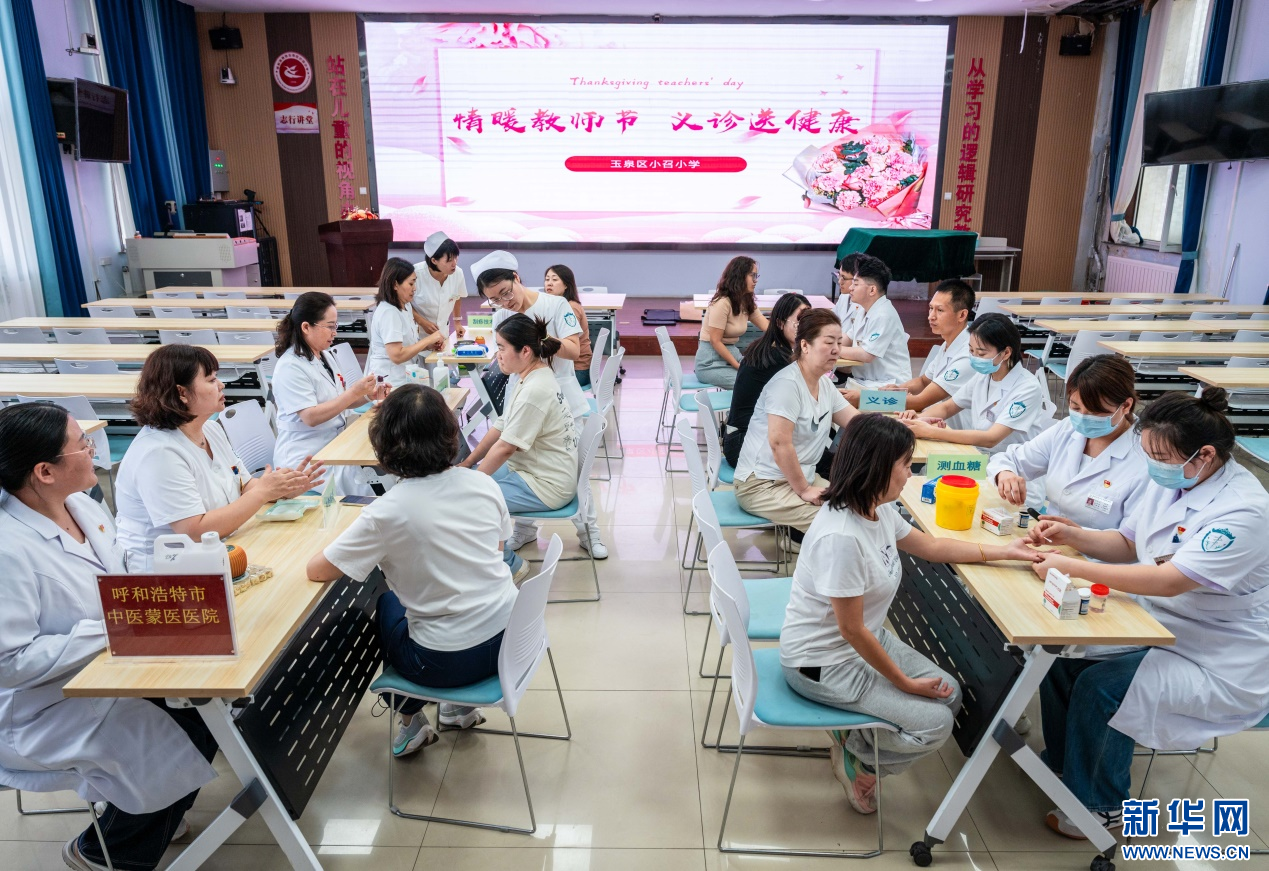 9月9日,医护人员在呼和浩特市玉泉区小召小学为老师们进行中医蒙医诊疗。新华网发(丁根厚 摄)