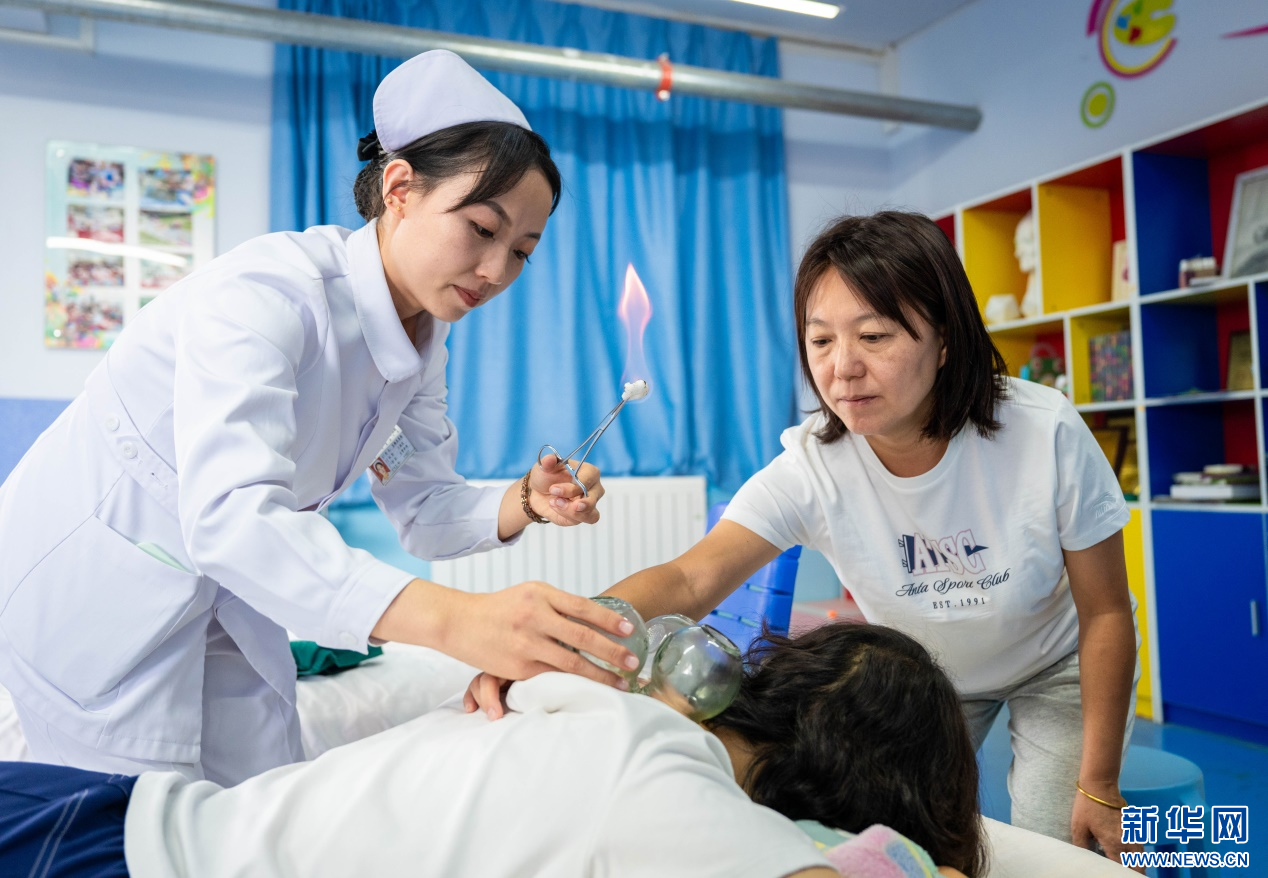 9月9日,医护人员在呼和浩特市玉泉区小召小学为老师们拔罐。新华网发(丁根厚 摄)
