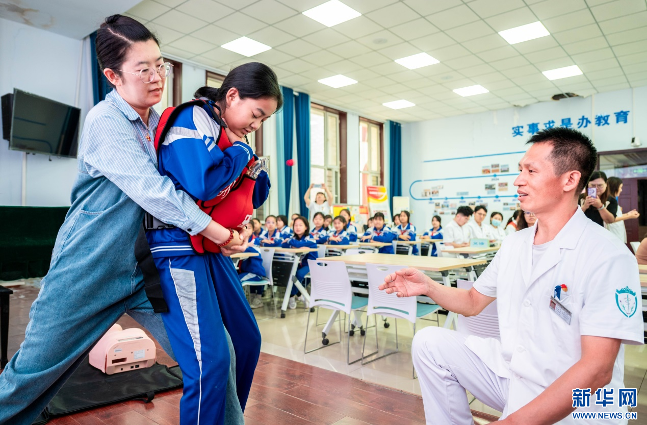 9月9日,医护人员在呼和浩特市玉泉区小召小学指导师生练习海姆立克急救法。新华网发(丁根厚 摄)