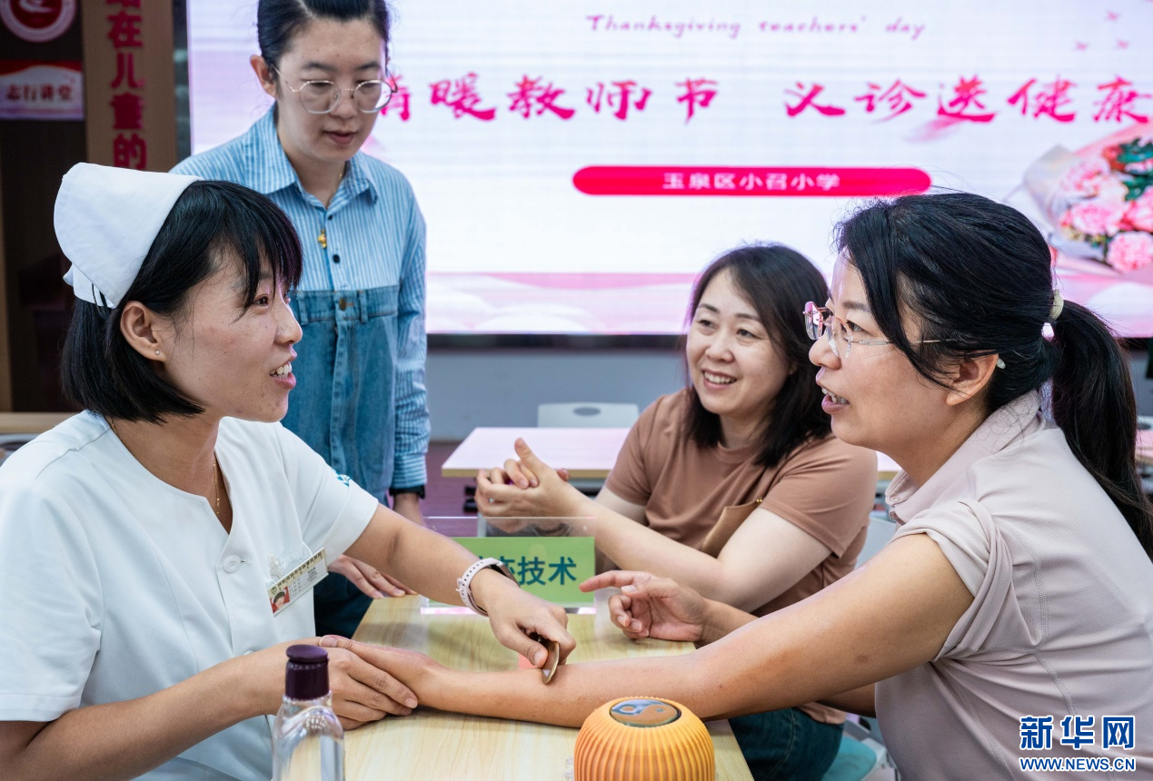 9月9日,医护人员在呼和浩特市玉泉区小召小学为老师们诊脉。新华网发(丁根厚 摄)