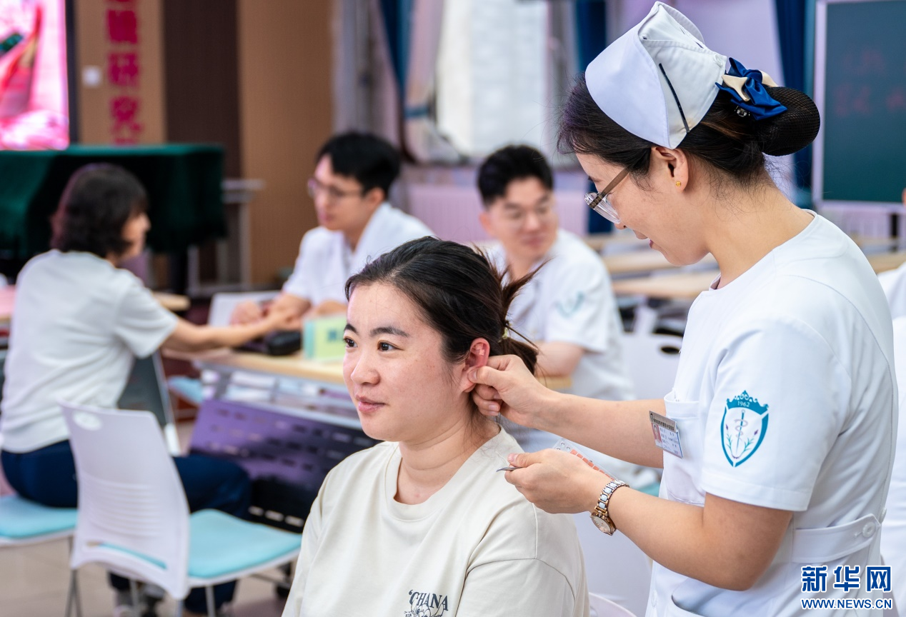 9月9日,医护人员在呼和浩特市玉泉区小召小学为老师们做耳穴贴压。新华网发(丁根厚 摄)