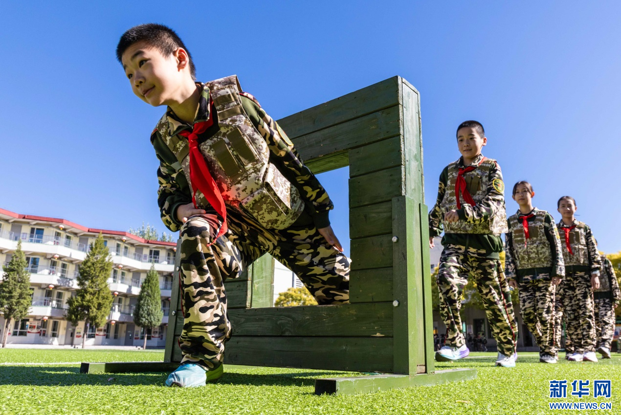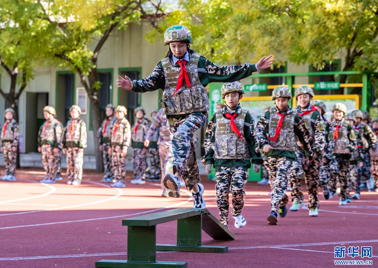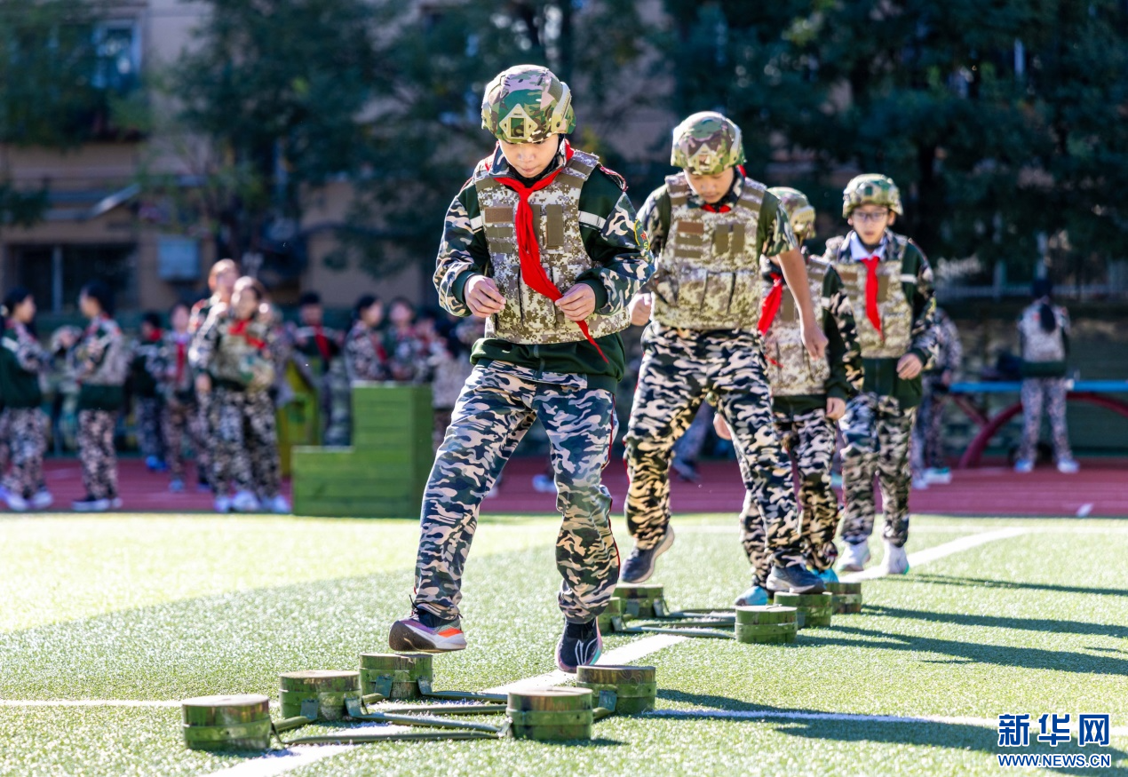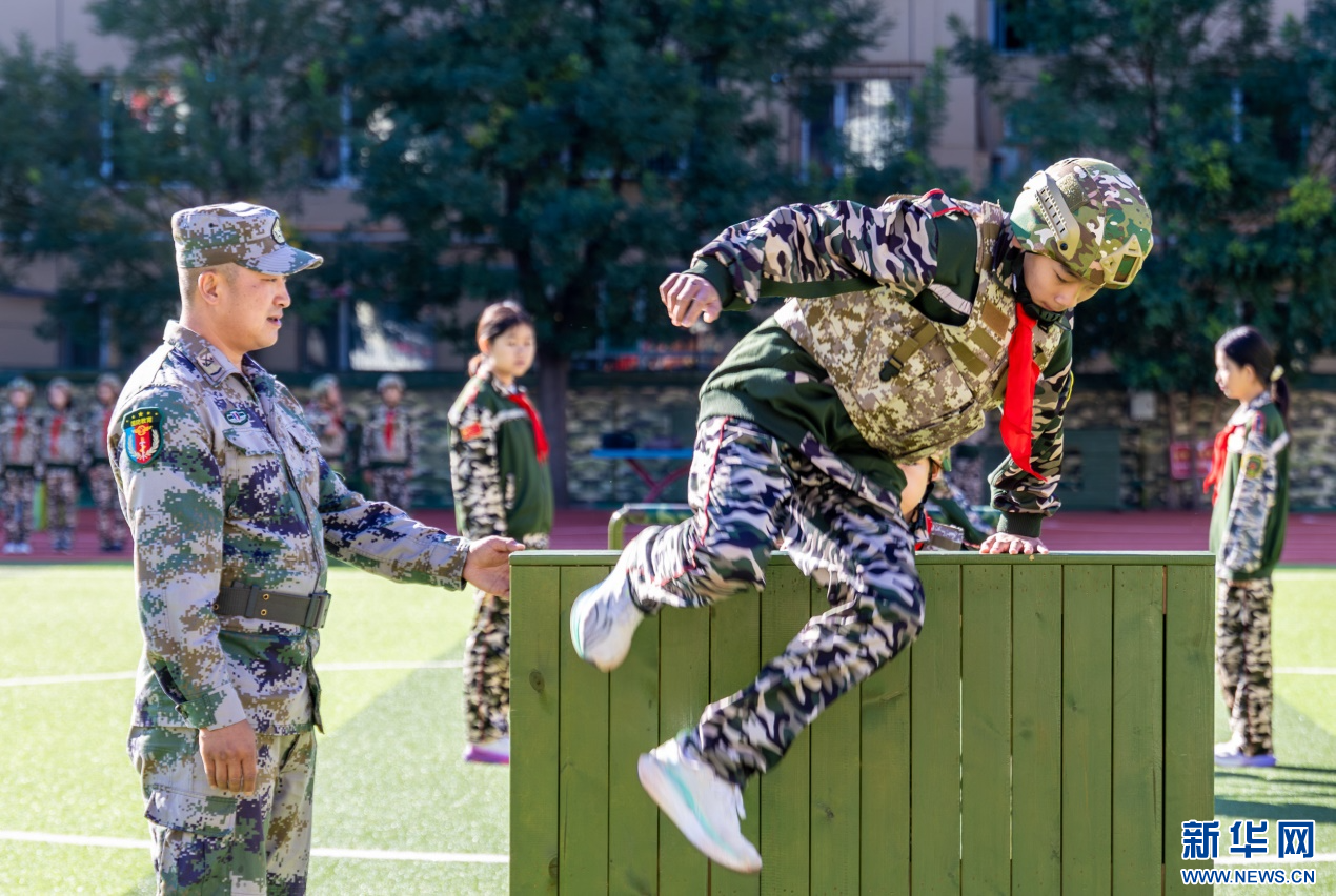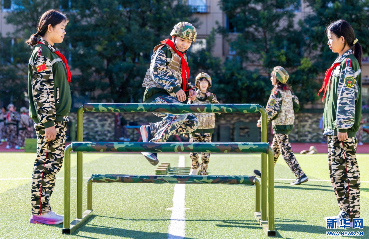 9月17日,呼和浩特市玉泉区五塔寺东街小学学生在“心系国防 强国有我”主题教育活动现场参加跨越障碍项目。新华网发(丁根厚 摄)