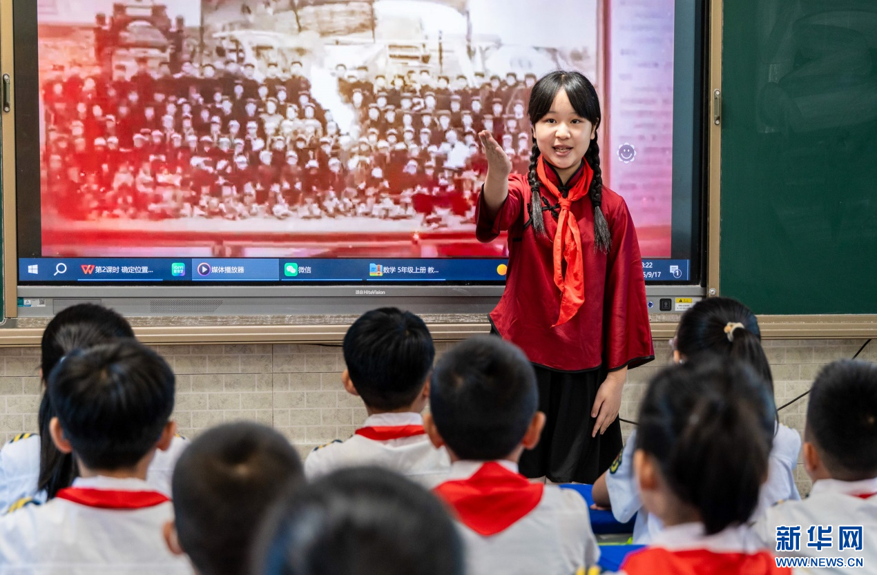 9月17日,呼和浩特市玉泉区五塔寺东街小学学生在“心系国防 强国有我”主题班队会上讲述抗战小故事。新华网发(丁根厚 摄)