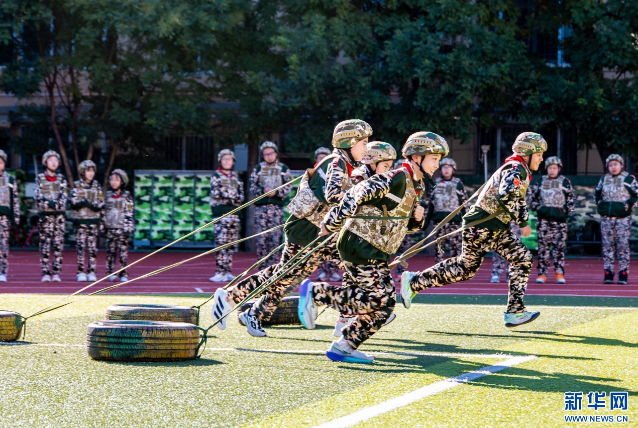 9月17日,呼和浩特市玉泉区五塔寺东街小学学生在“心系国防 强国有我”主题教育活动现场参加轮胎拉力赛比拼。新华网发(丁根厚 摄)