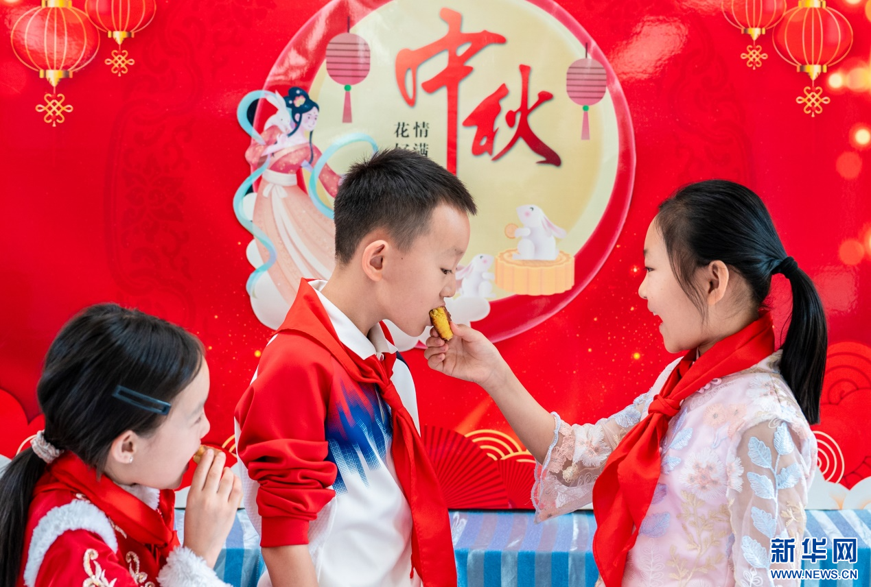 9月28日,呼和浩特市玉泉区清泉街小学学生在中秋节主题活动上品尝自己制作的月饼。新华网发(丁根厚 摄)