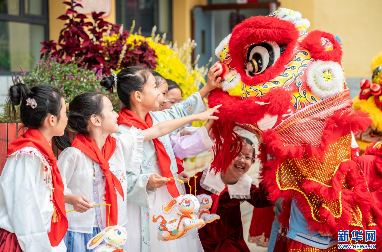 9月28日,呼和浩特市玉泉区清泉街小学表演舞狮的学生在中秋节主题活动上和同学们互动。新华网发(丁根厚 摄)