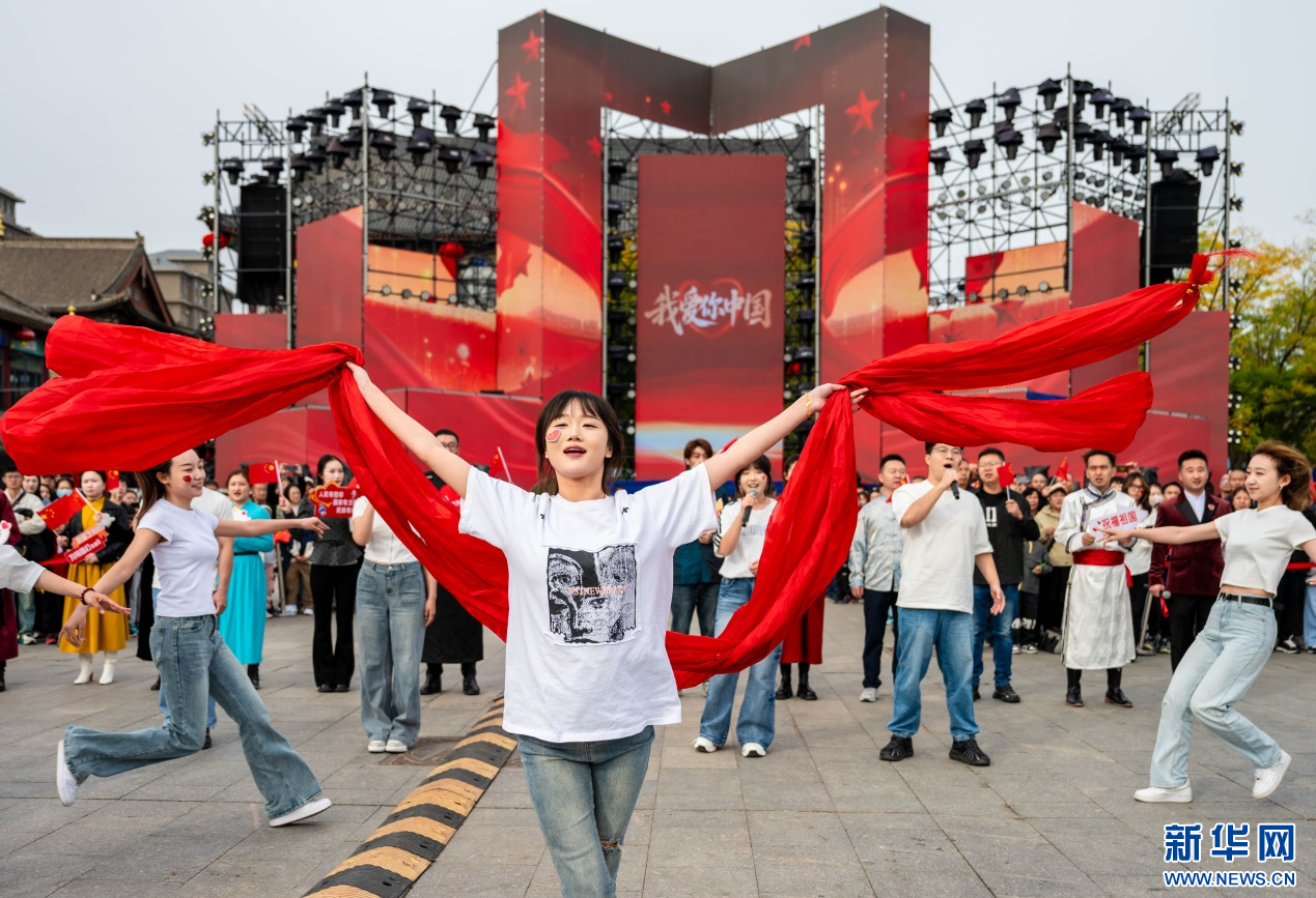 10月1日,内蒙古师范大学马克思主义学院的学子们参加“行走的思政课”快闪活动,祝福伟大祖国繁荣昌盛。新华网发(丁根厚 摄)