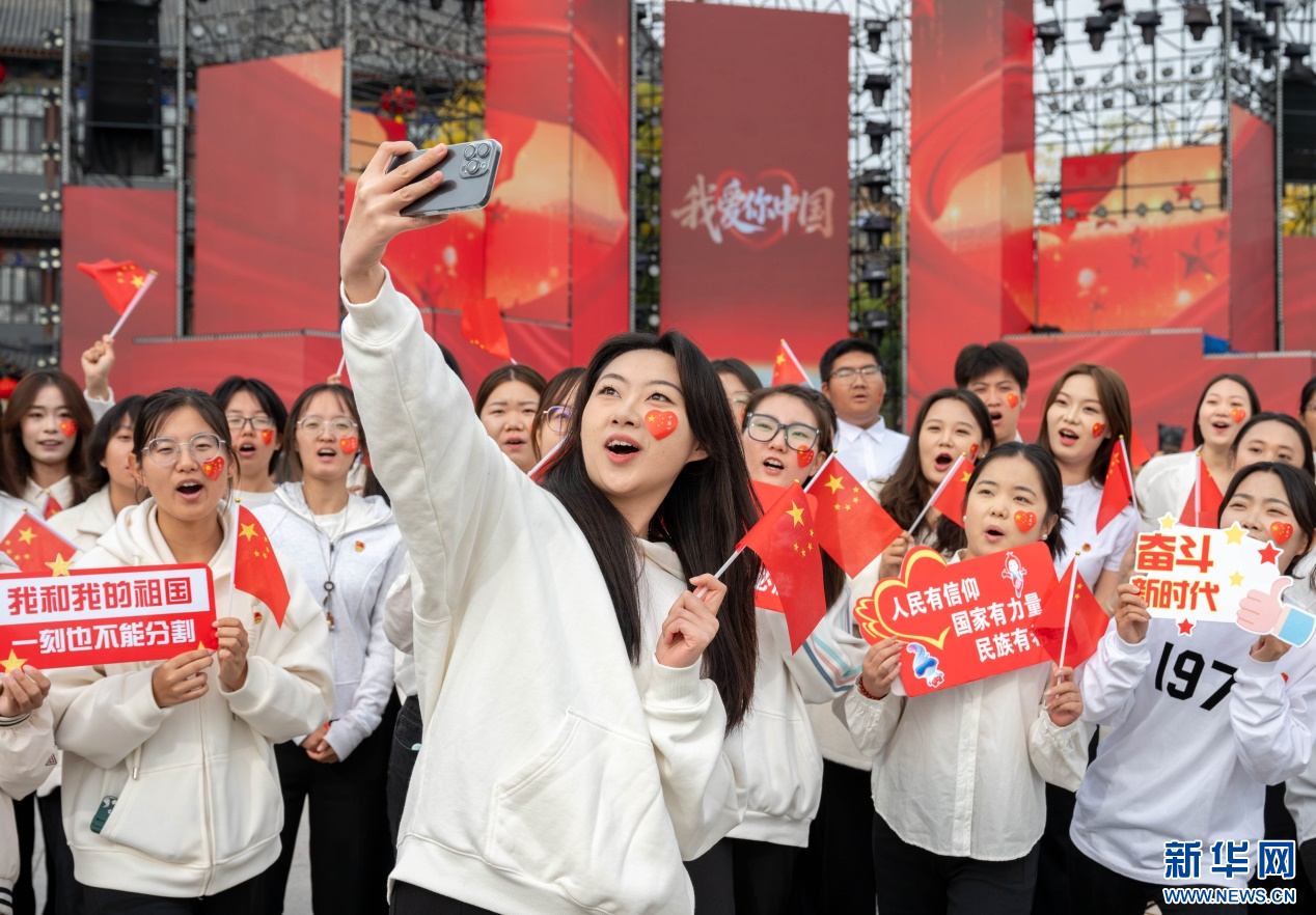 10月1日,内蒙古师范大学马克思主义学院的学子们在“行走的思政课”快闪活动现场自拍留影。新华网发(丁根厚 摄)
