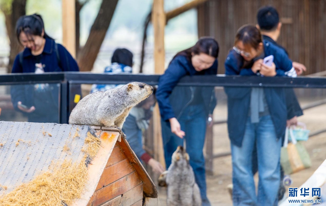 10月4日,呼和浩特市玉泉区林下郊野萌宠乐园,游客与土拨鼠互动。新华网发(丁根厚 摄)