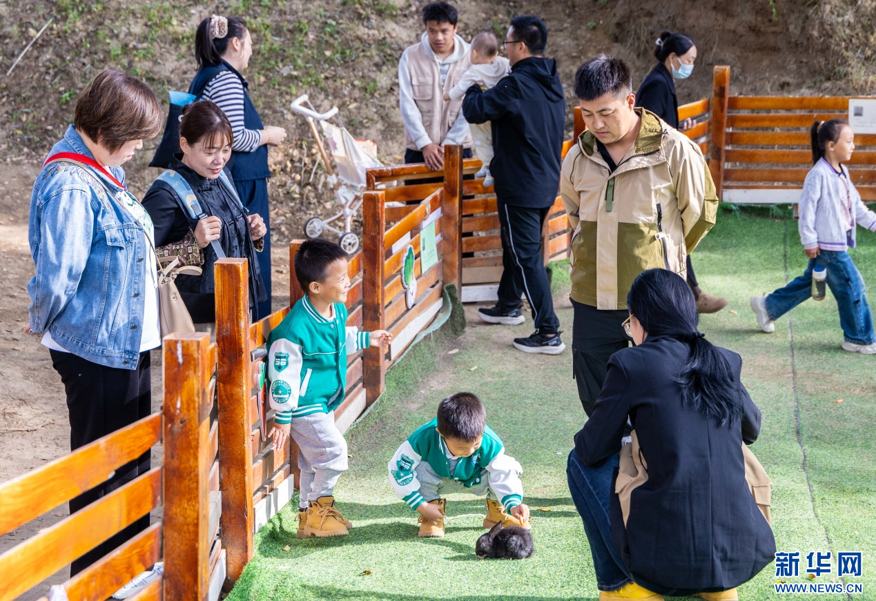 10月4日,呼和浩特市玉泉区林下郊野萌宠乐园,小朋友与小兔子互动。新华网发(丁根厚 摄)