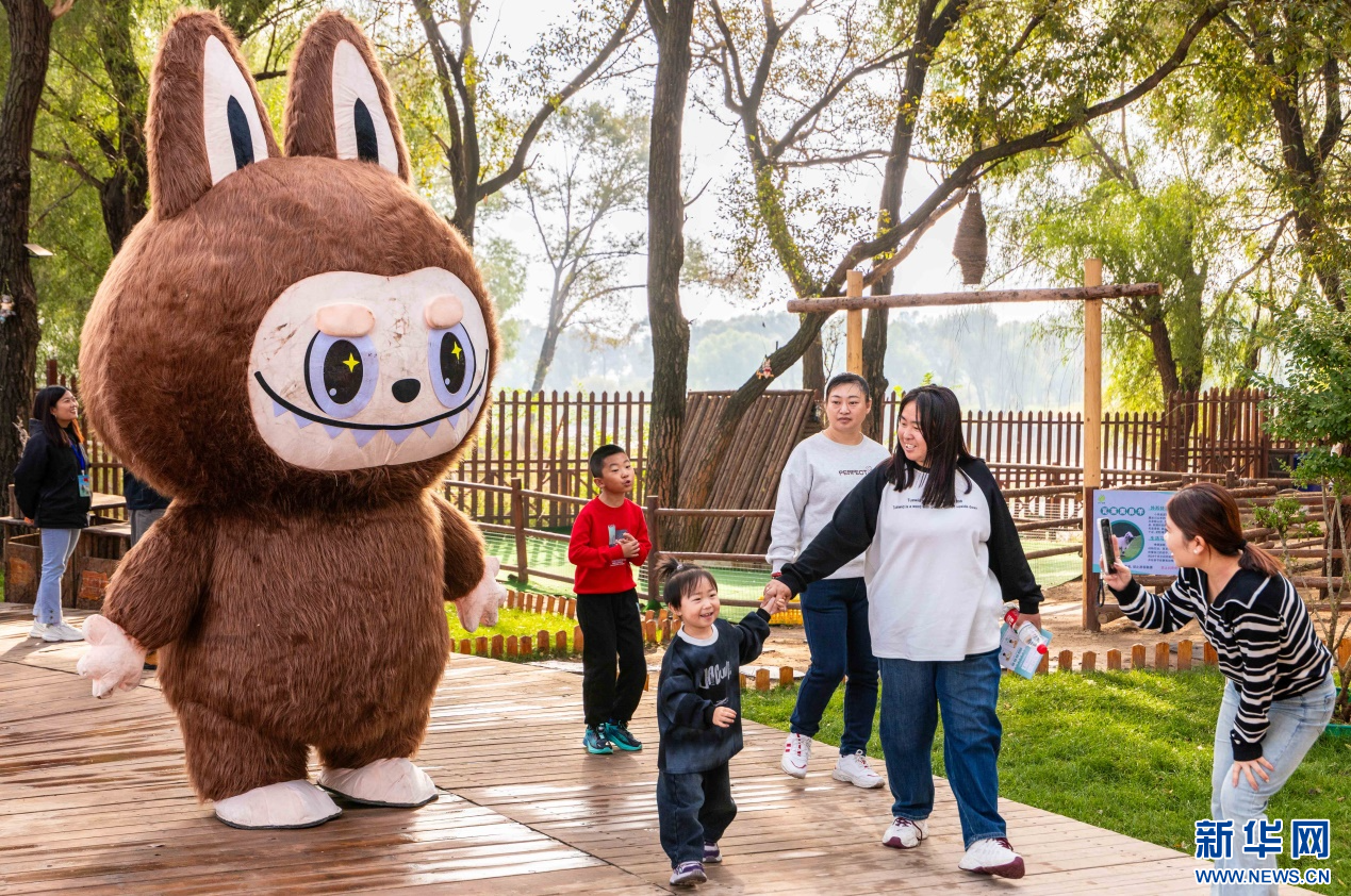 10月4日,呼和浩特市玉泉区林下郊野萌宠乐园,家长给孩子与拉布布人偶拍照留影。新华网发(丁根厚 摄)