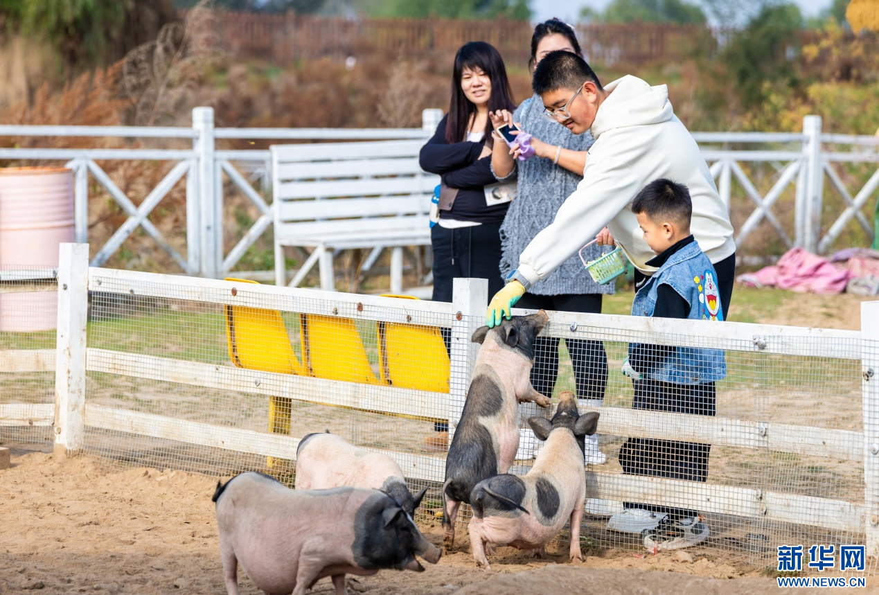 10月4日,呼和浩特市玉泉区林下郊野萌宠乐园,小朋友与小猪互动。新华网发(丁根厚 摄)