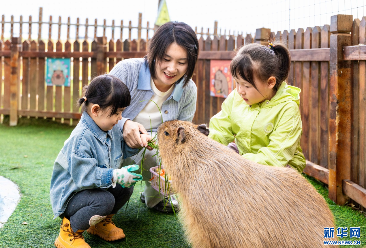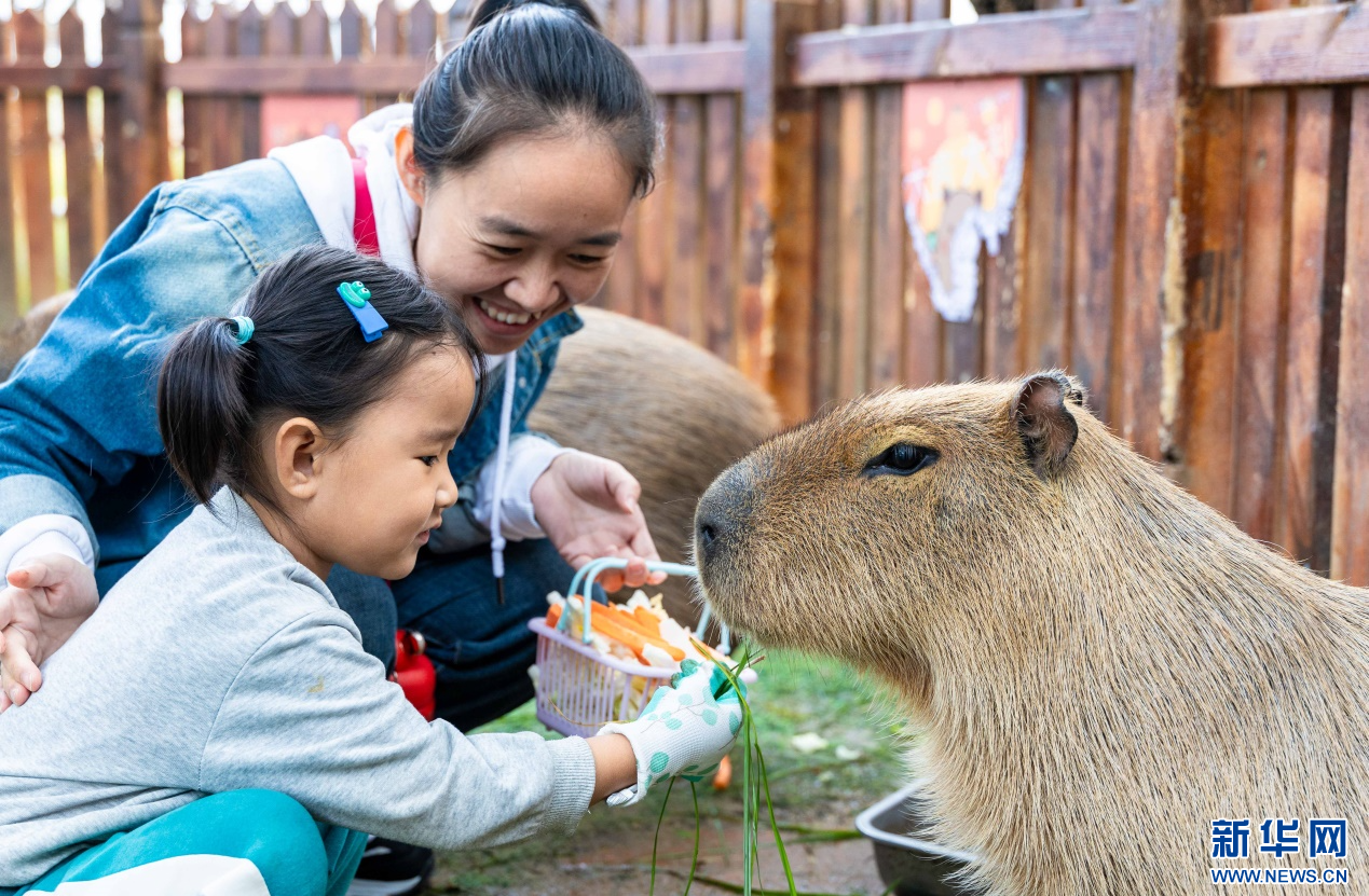10月4日,呼和浩特市玉泉区林下郊野萌宠乐园,小朋友给卡皮巴拉喂食。新华网发(丁根厚 摄)
