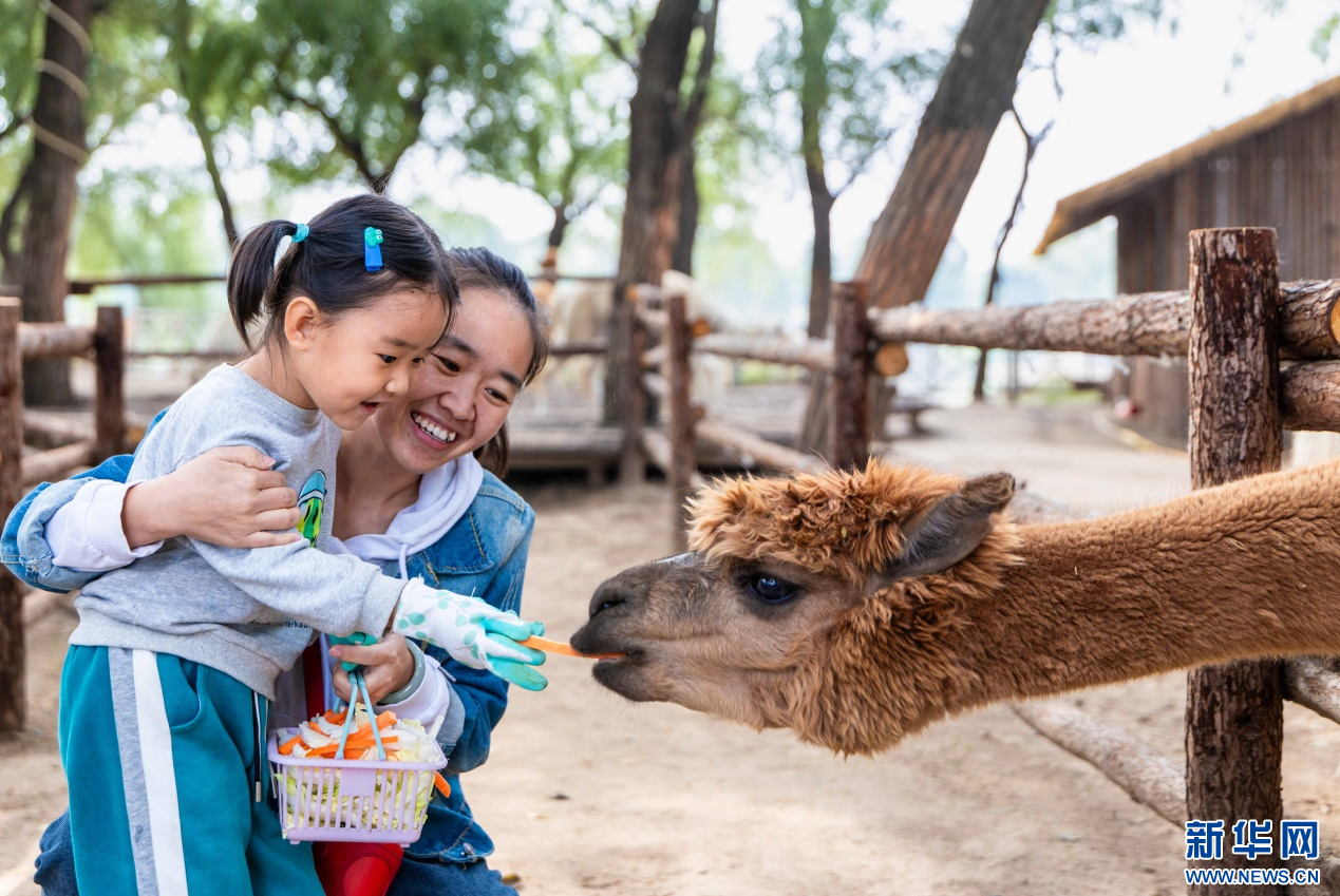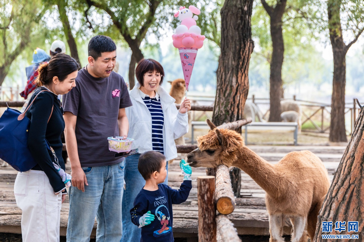 10月4日,呼和浩特市玉泉区林下郊野萌宠乐园,小朋友给羊驼喂食。新华网发(丁根厚 摄)