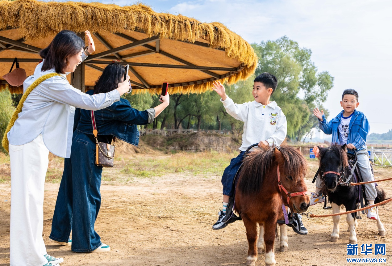 10月4日,呼和浩特市玉泉区林下郊野萌宠乐园,小朋友骑矮马游览。新华网发(丁根厚 摄)