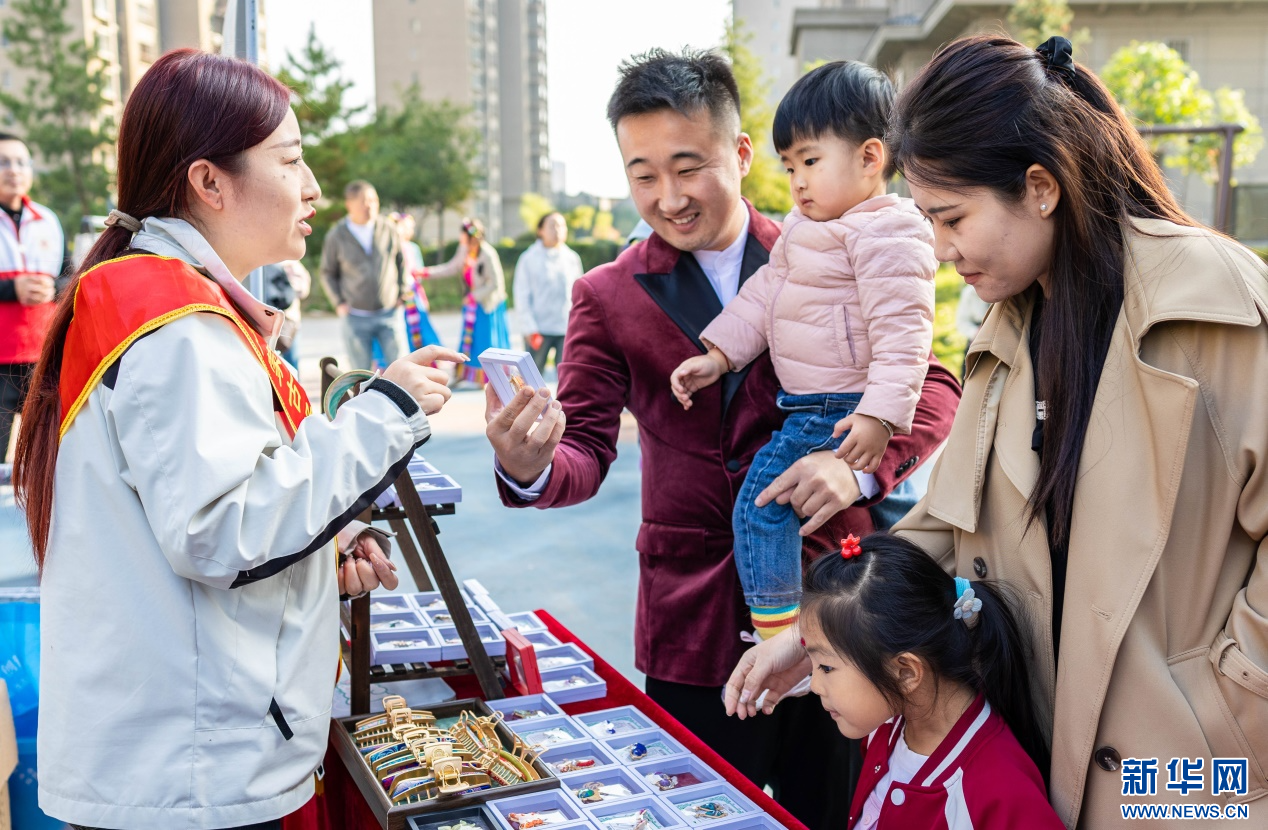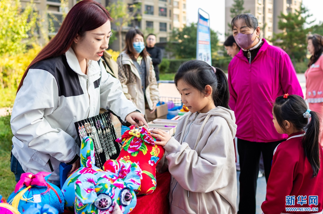 10月14日,呼和浩特市玉泉区“文明市集”主题活动现场,社区居民在了解“敕勒川巧娘”民族手工艺品。新华网发(丁根厚 摄)