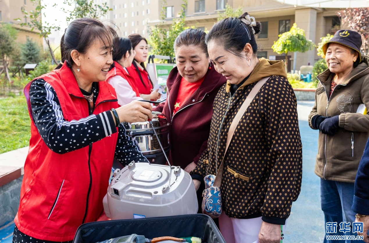 10月14日,呼和浩特市玉泉区“文明市集”主题活动现场,志愿者在为社区居民修理小家电。新华网发(丁根厚 摄)