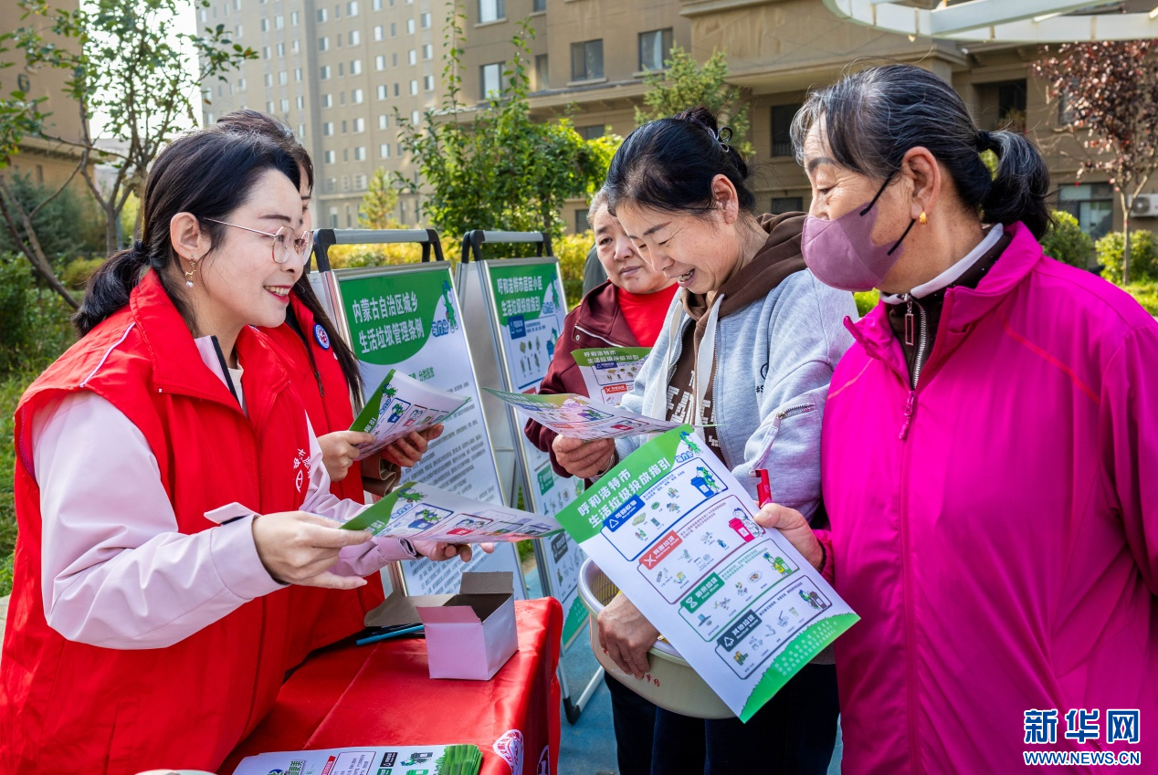 10月14日,呼和浩特市玉泉区“文明市集”主题活动现场,志愿者向居民普及垃圾分类的相关常识。新华网发(丁根厚 摄)