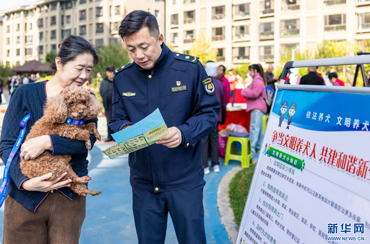 10月14日,呼和浩特市玉泉区“文明市集”主题活动现场,城管队员给居民讲解文明养犬知识。新华网发(丁根厚 摄)