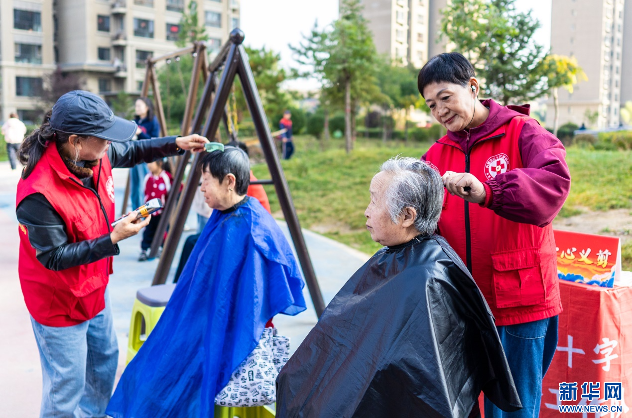 10月14日,呼和浩特市玉泉区“文明市集”主题活动现场,内蒙古红十字仁爱妈妈志愿服务队队员为居民义剪。新华网发(丁根厚 摄)