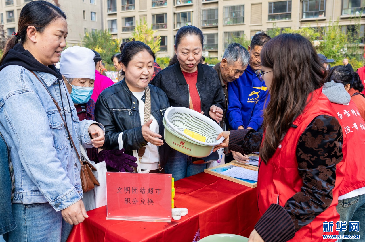 10月14日,呼和浩特市玉泉区“文明市集”主题活动现场,社区居民用平日积攒的“民族团结积分”兑换日用品。新华网发(丁根厚 摄)