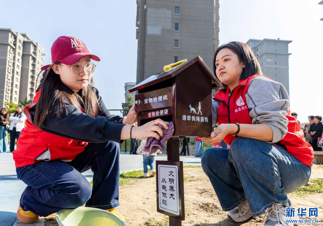 10月14日,呼和浩特市玉泉区“文明市集”主题活动现场,志愿者在擦拭“文明养犬”宠物便民箱。新华网发(丁根厚 摄)