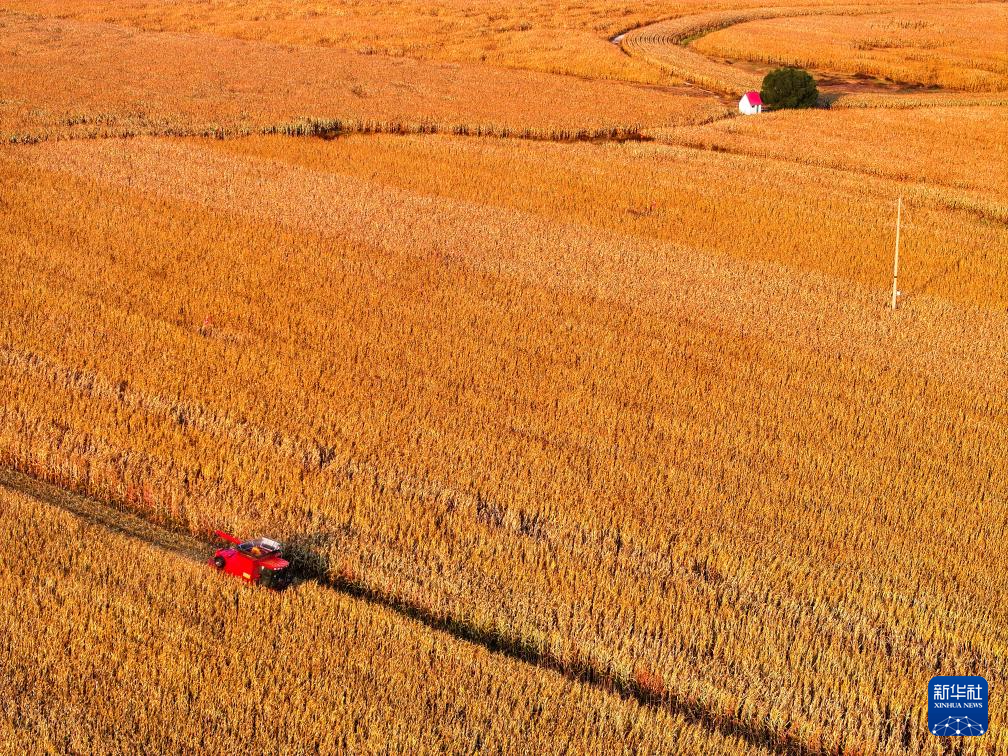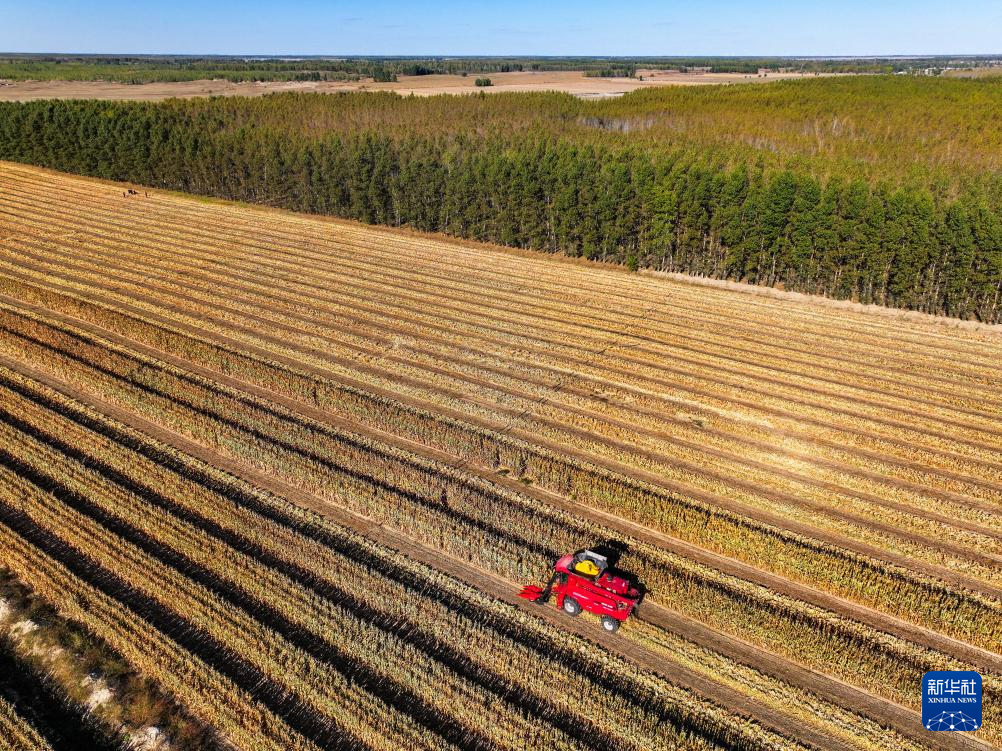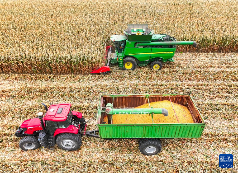 10月14日,在通辽市科尔沁区丰田镇,农机手驾驶收割机收割玉米(无人机照片)。