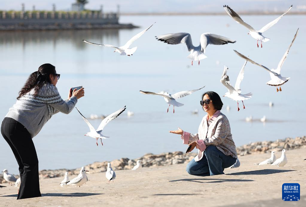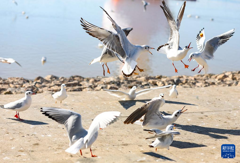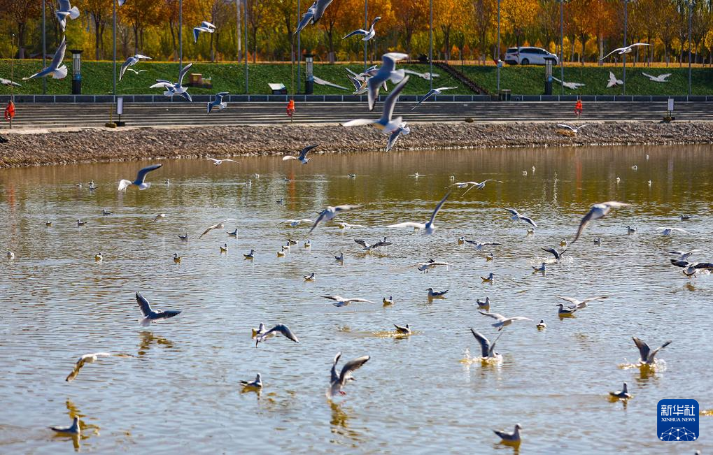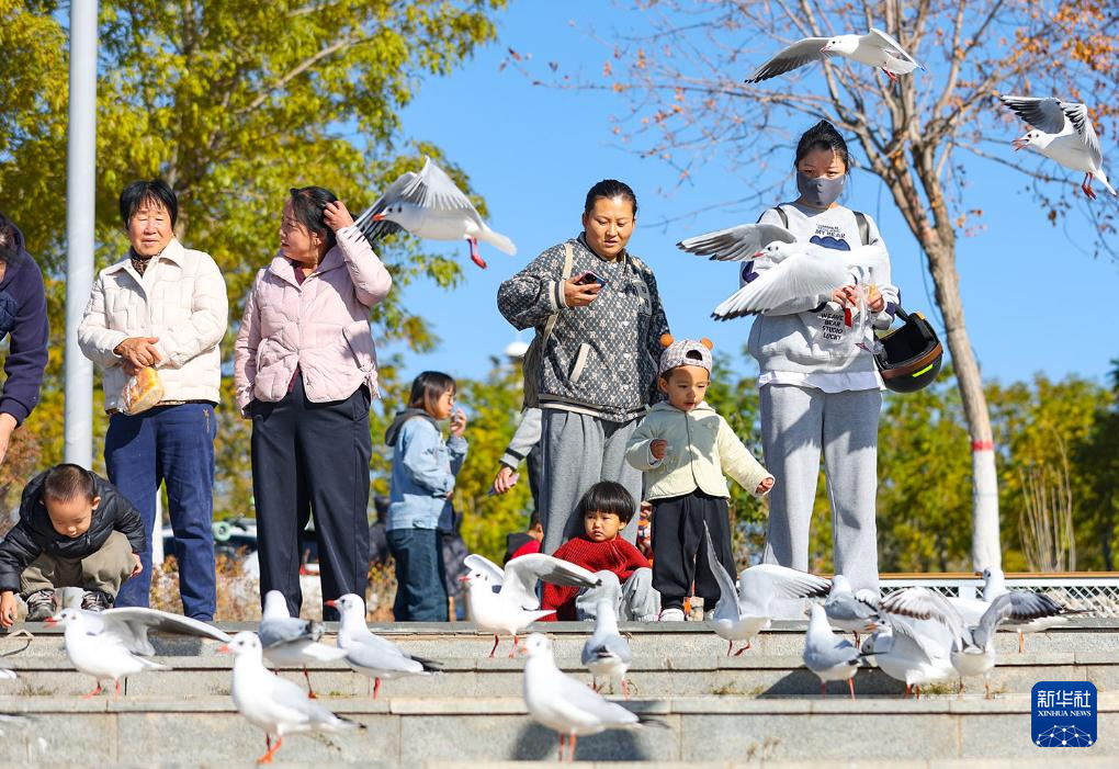 深秋时节,大批南飞越冬的红嘴鸥在内蒙古乌海市境内的乌海湖驻足觅食、栖息,引来众多市民游客前来观赏并与之互动,绘就人鸥同乐的靓丽风景。近年来,随着乌海湖及周边生态环境持续向好,途经这里的候鸟数量和种类逐年增加。(康文魁 摄影报道)