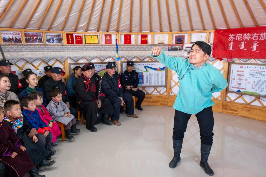 11月12日,在内蒙古锡林郭勒盟苏尼特右旗额仁淖尔苏木吉呼郎图嘎查,乌兰牧骑的退役演员在演出前开展学习贯彻党的二十届四中全会精神宣讲活动。 68年过去了,曾经的文艺青年们变成了文艺中年、文艺老前辈,他们手中“红色文艺轻骑兵”的旗帜却传下去了。