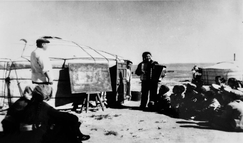 20世纪70年代,苏尼特右旗乌兰牧骑的演员们在辅导牧区孩子们演唱歌曲。