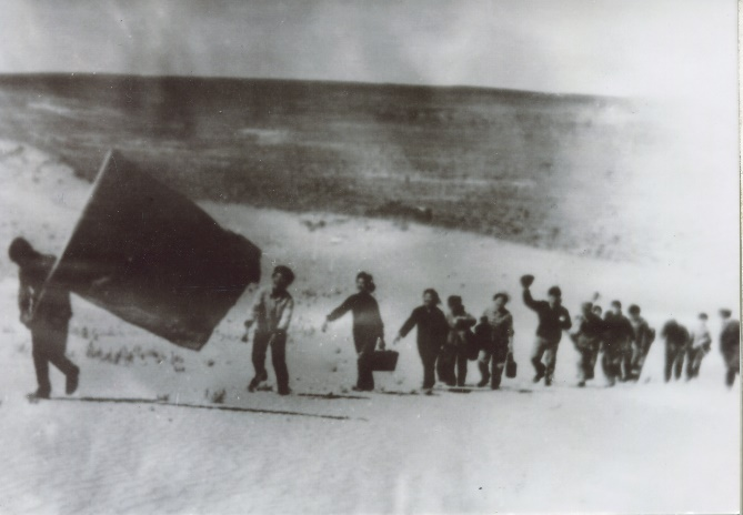 20世纪70年代,苏尼特右旗乌兰牧骑的演员们冒着风雪下乡演出。