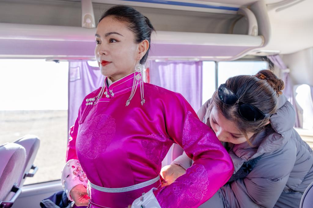 11月12日,在内蒙古锡林郭勒盟苏尼特右旗额仁淖尔苏木吉呼郎图嘎查,演员走出下乡演出的大巴车。