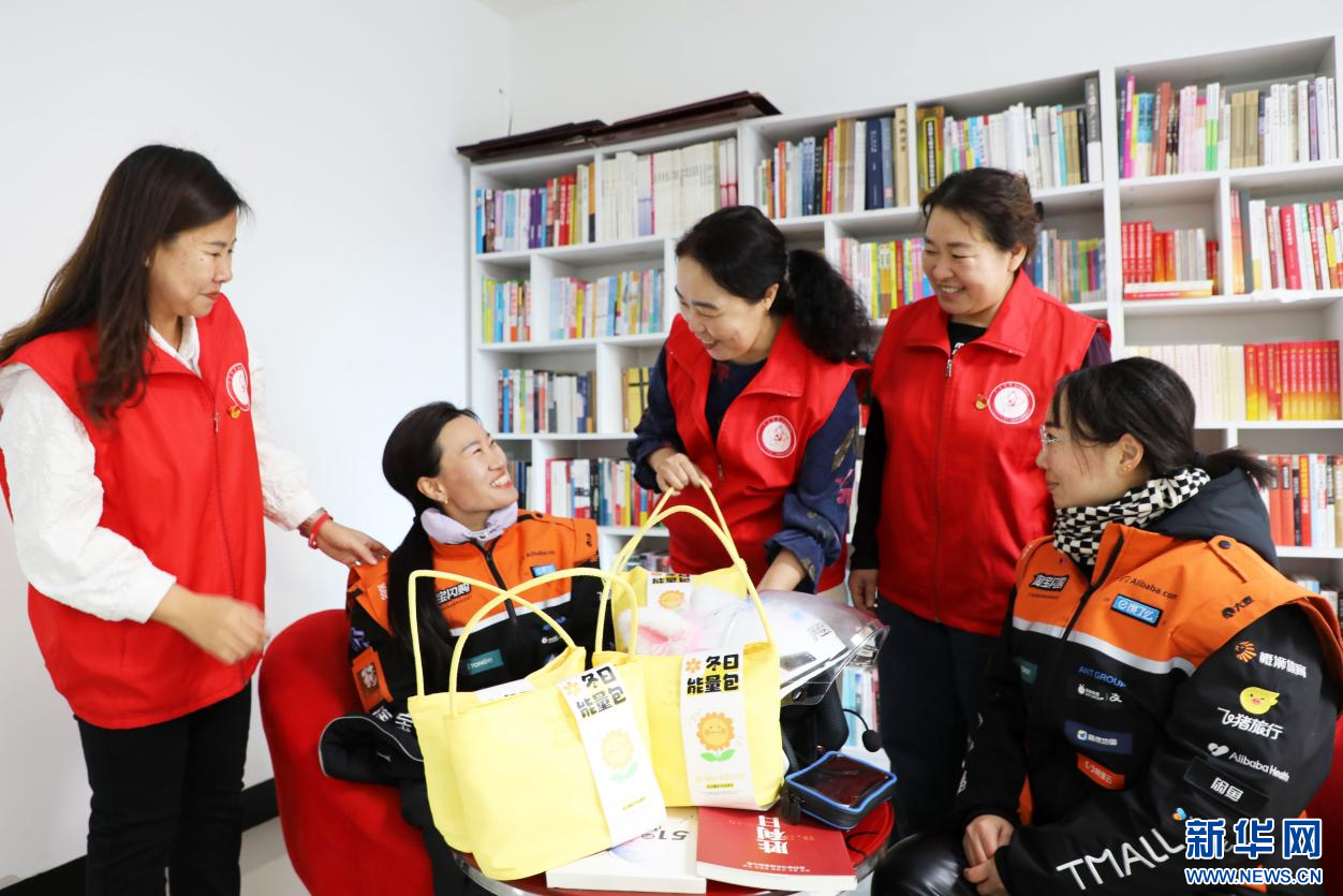 12月2日,在内蒙古自治区扎兰屯市繁荣街道光明社区淘宝闪购骑士驿站,志愿者为外卖骑手赠送“能量包”。新华网发(韩颖群 摄)
