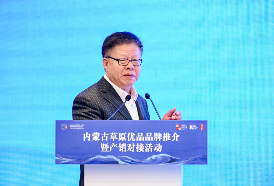 12月5日,张国在2025中国企业家博鳌论坛内蒙古草原优品品牌推介暨产销对接活动中作主旨演讲。新华网发
